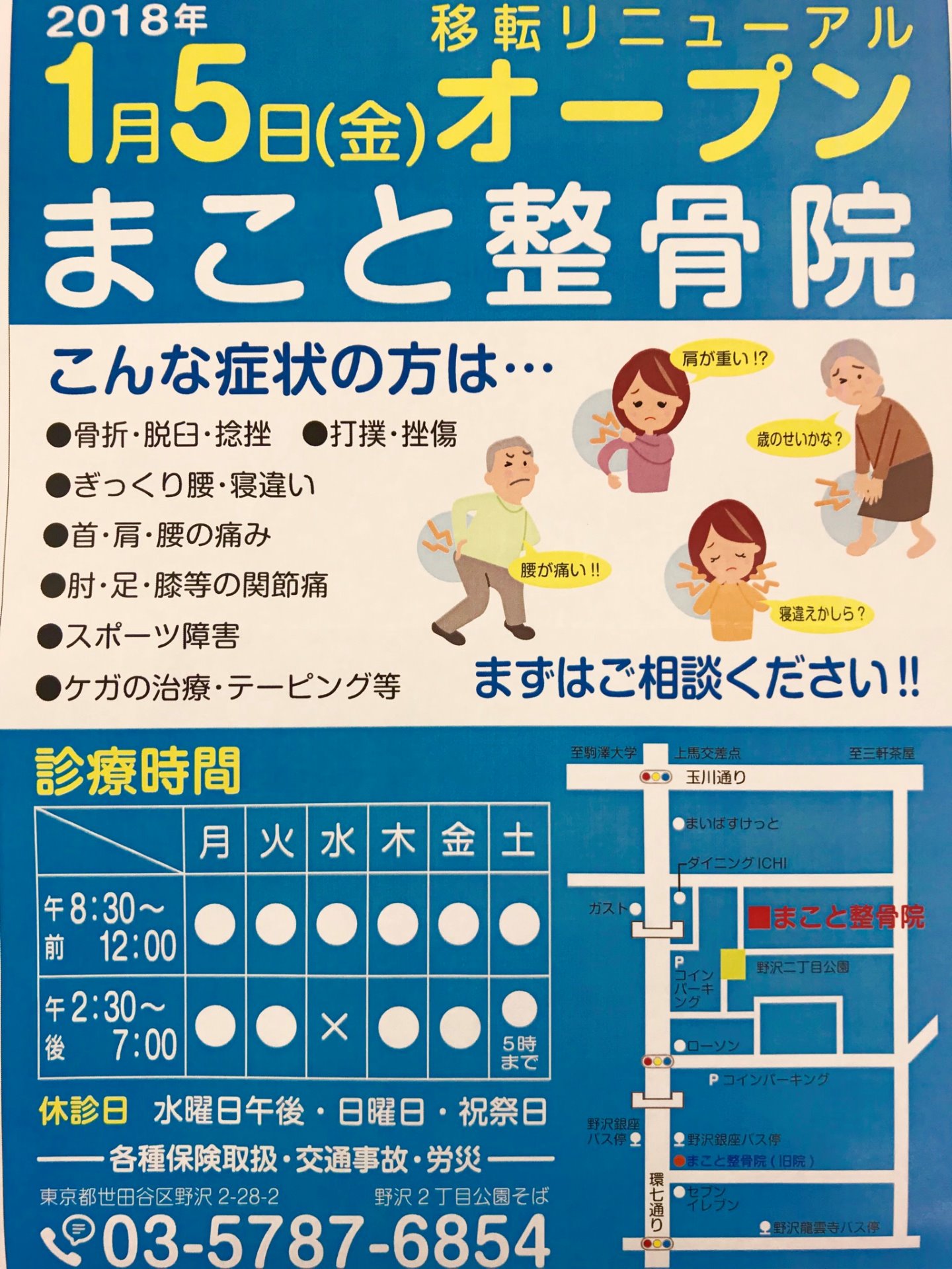 この度、まこと整骨院は2018年の年始より移転することになりました。気持ちを新たに、皆様に末長くご利用頂ける整骨院を目指して参ります。ご迷惑おかけいたしますが、今後ともよろしくお願い致します。